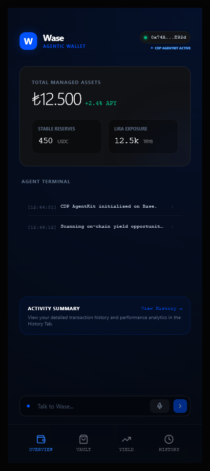 Wase Wallet turns a passive wallet interface into an execution surface. Users can set purchase intents, route capital into yield, monitor risks, and operate a Base-native treasury through one AI-led control layer.