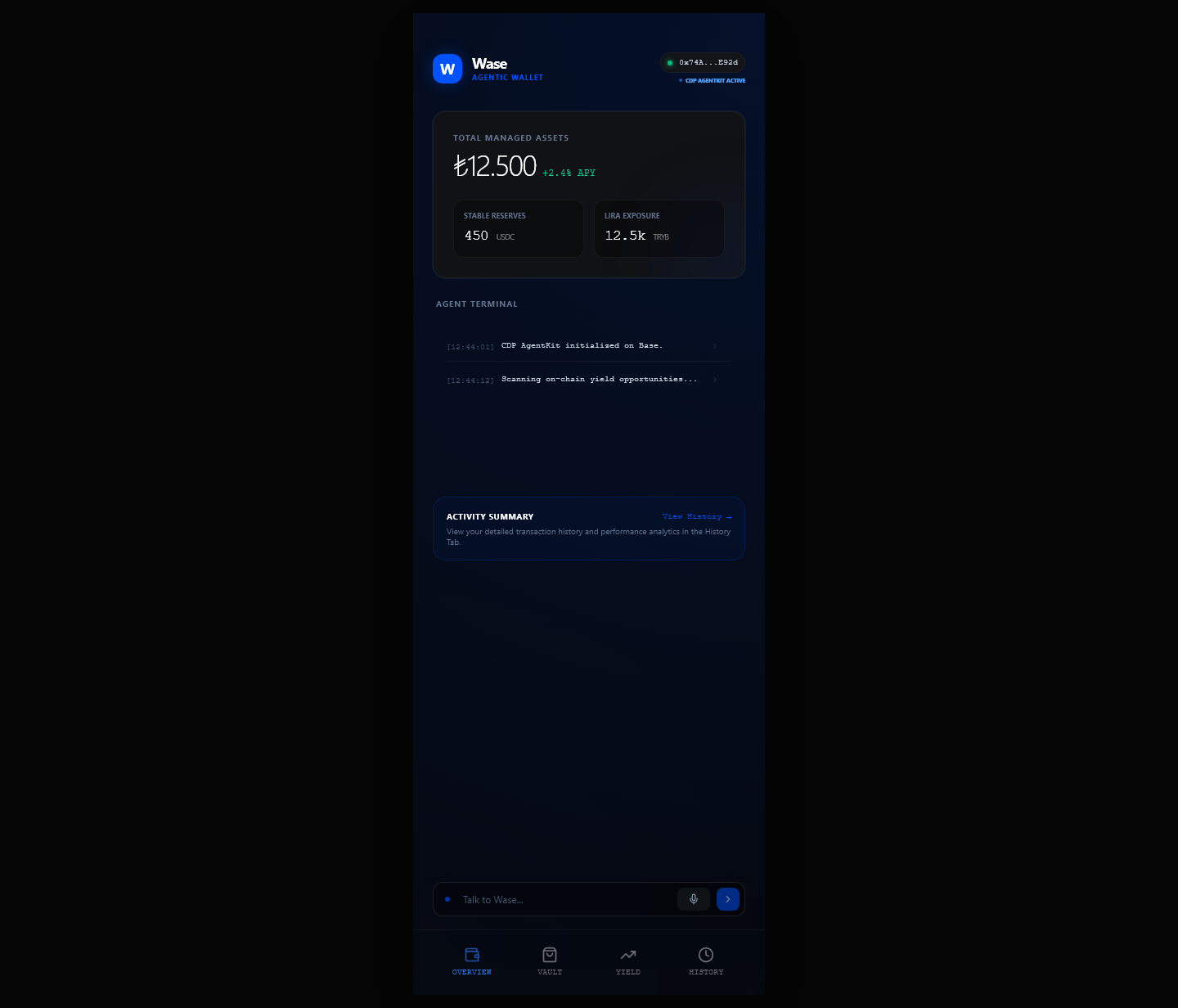 Wase Wallet turns a passive wallet interface into an execution surface. Users can set purchase intents, route capital into yield, monitor risks, and operate a Base-native treasury through one AI-led control layer.
